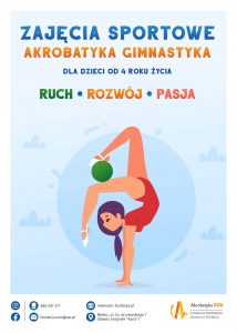 Akrobatyka to działania zmierzające do podnoszenia sprawności fizycznej, kontrolowania ruchów ciała i opanowania psychicznego w sytuacjach ekstremalnych. Akrobatyka jest doskonałym sposobem na aktywność fizyczną. Dzięki niej dziecko otrzymuje dużą dawkę ruchu oraz przyzwyczaja się do regularnego uprawiania sportu.Treningi wzmacniają wiele grup mięśniowych, poprawiają zwinność, skoczność oraz utrzymywanie równowagi.